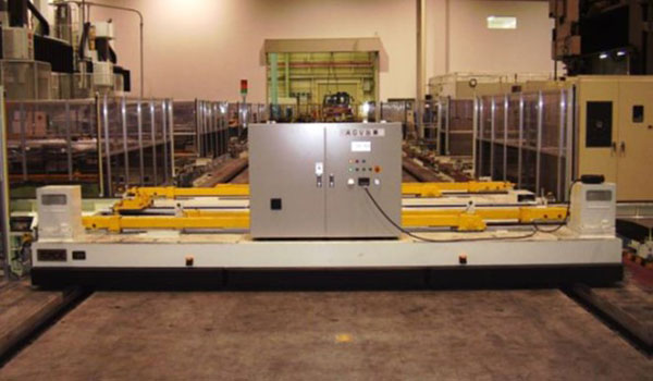 - 概要:車上コンベアによりワークを自動移載。建屋間を自動搬送。